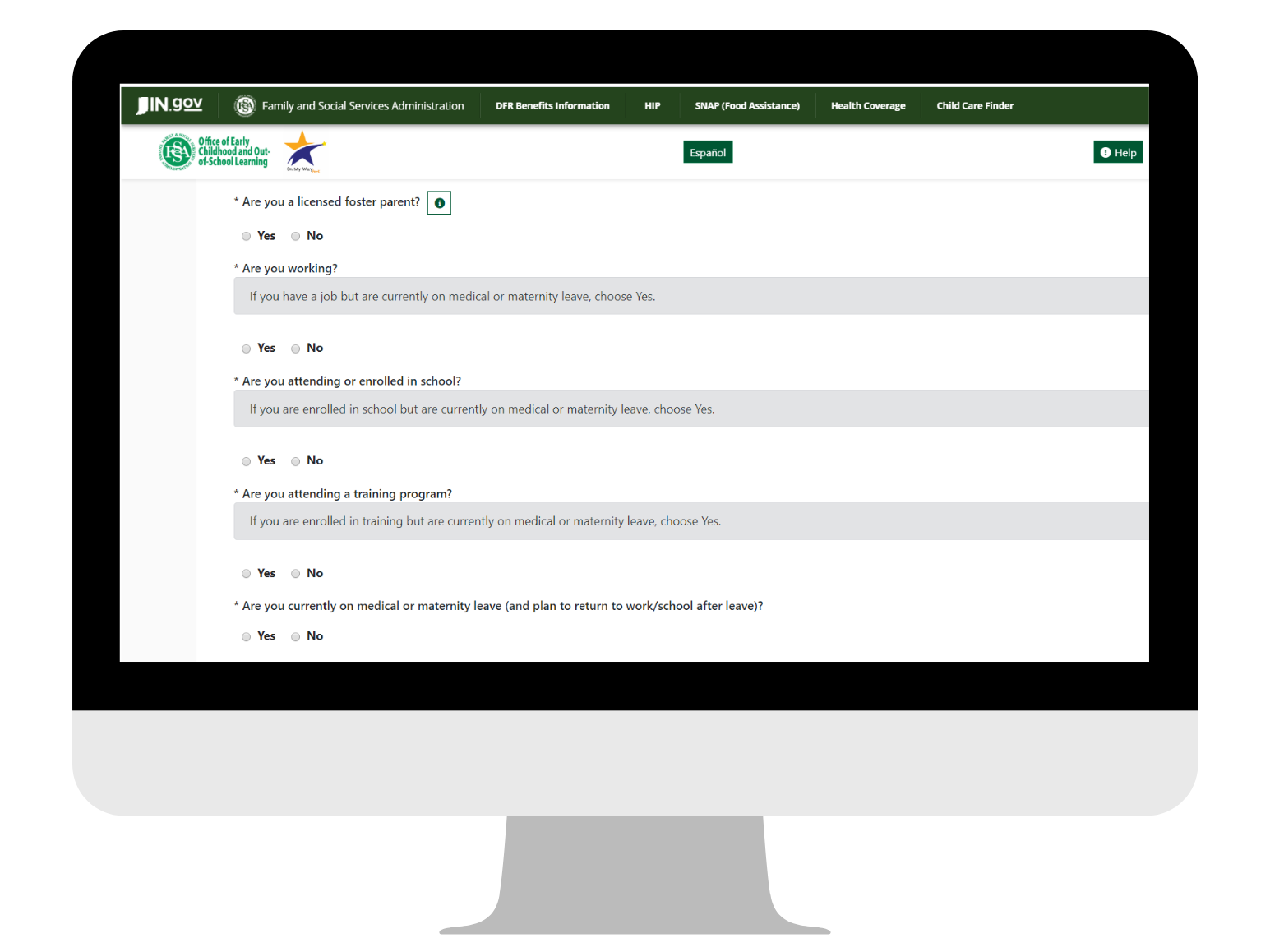 You can apply for child care assistance at any time by going to Indiana's easy to use on-line application, Early Ed Connect. When you apply, you will need to indicate the service need that you had prior to your leave or will have once your leave is over. If you are applying for child care assistance in Early Ed Connect, you will check YES in your application for the question below: