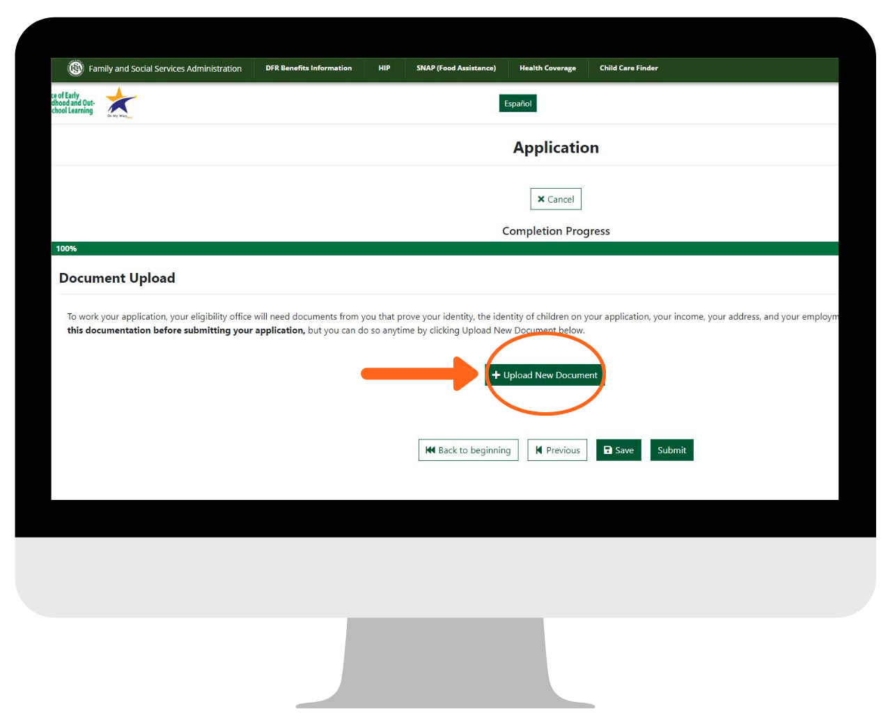 To complete your application, your local eligibility office will need documents from you. You do not have to provide these before submitting your online application, but you can do so anytime by clicking the green Upload New Documents button. Uploading documents to Early Ed Connect is easy, safe and secure.
