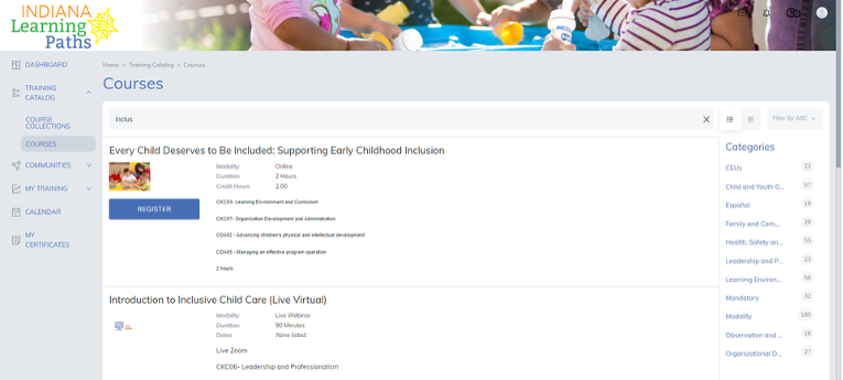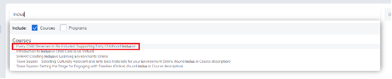 Ex: Typing in part of a word like “inclu” can help locate any courses that focus on “Inclusion,” or typing ‘orient’ and pressing “Enter” can locate the orientation trainings.