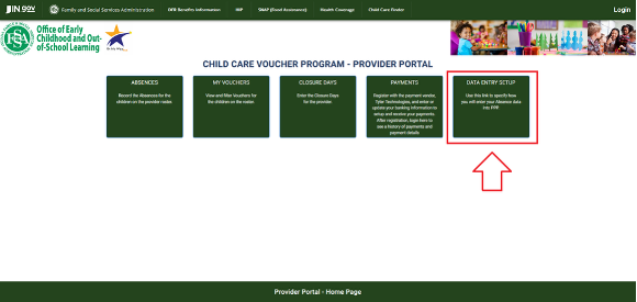 The Data Entry Setup section of the Parent Provider Portal (PPP) is used to determine how a provider admin will submit their CCDF/OMW absences. There are two options for setting up how the absences are recorded and submitted: