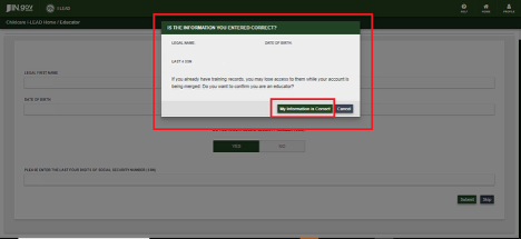 5.) Verify the information you entered is correct. If it is, click My Information is Correct. If not, click Cancel to go back to the previous page and make the necessary edits.