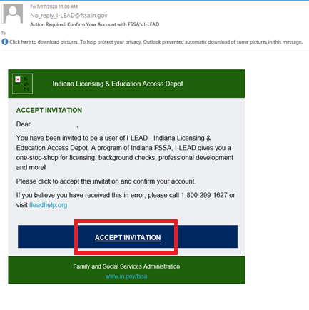 Note: The email comes from No_reply_I-LEAD@www.in.gov. It may be in the junk/spam folder if it is not in your inbox. Select the email with the most recent date and timestamp, and accept the invitation on a single device.