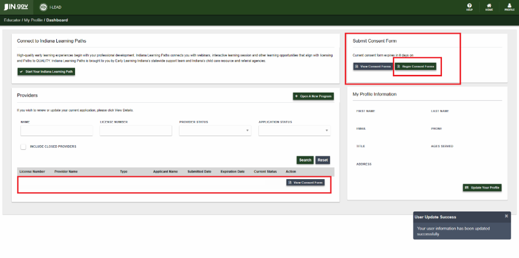 Make sure all licenses you belong to are listed before starting a consent form. If any are missing from the Provider section of the I-LEAD Dashboard, accept those first. Then do the consent form after all locations are added.