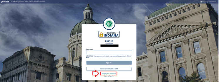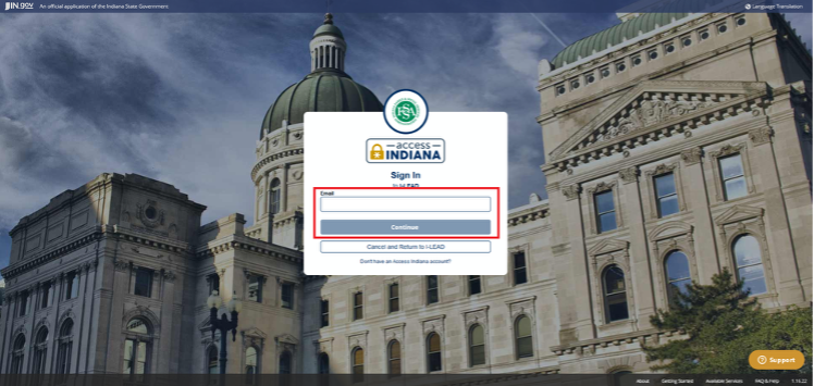 - You will be re-routed to the Access Indiana log-in page. If you have created an Access Indiana account with the same email address as your I-LEAD account but do not recall the logins, enter the email address, click Continue and use the "Forgot Your Password?" button. If you never made an Access Indiana account with this email, create an Access Indiana account instead using this step-by-step guide.