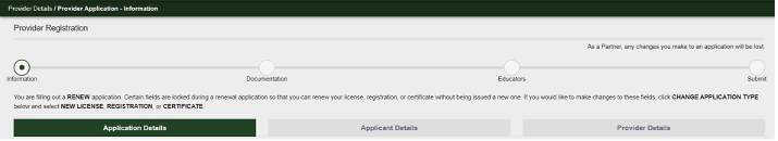 There are four sections (Information, Documentation, Educators and Review) on the renewal application: