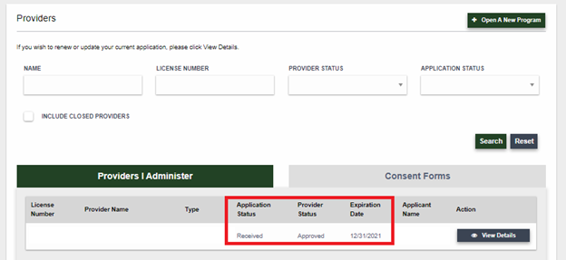 1. On the Providers section of the I-LEAD Dashboard, click View Details for the license set to expire. This will take you to the Provider Details page for that particular license.