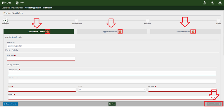 4. Information: This is the first page of the application. It is split into three categories: Application Details, Applicant Details and Provider Details. Application Details is the first box highlighted in green at the top of the page when the application is opened. After completing this section, click on the other boxes at the top of the page to access the other categories.