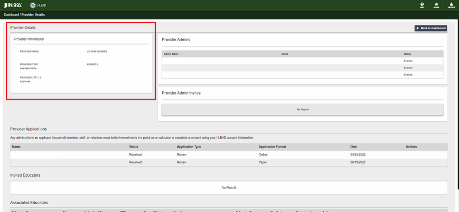 Educator Invitations & Consent Forms Post-Submission: Staff who were only on the Associated Educator Roster section of the application will receive a new consent form to complete for the new license number. Everyone new who was listed on the Invited Educators section of Educators in the application will receive an email from no_reply_i-lead@fssa.in.gov after the application has been signed and submitted. Make sure each person has created an I-LEAD account before they accept the educator invitations sent to their email inboxes. If the educator invitations are successfully accepted, each person will have the license number listed in the Provider section of their I-LEAD dashboard and have a consent form to complete and submit with their fingerprints. New and old staff need to complete these for the new licensing application to be processed. Those educators missing an educator invitation should be invited by the person filling out the application. Once all changes and consent forms for a background check have been completed, the licensing consultant will reach out. New provider admins need to accept both an admin invitation to access the license and an educator invitation to access the consent form for a background check.
