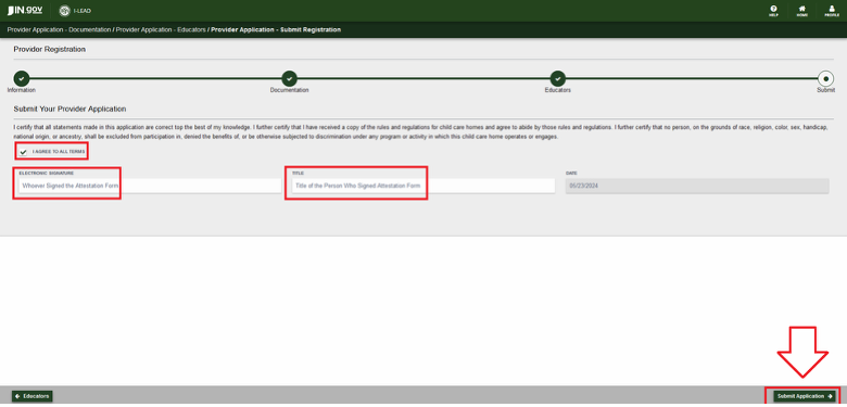 7. Submit: This section should be signed and submitted by the applicant who filled out the attestation statement. The attestation statement and signature should be signed by the owner for a home, the director for a center or the pastor/religious leader for a ministry. If you need to add them, click the Educators button to go back and add them as an applicant.