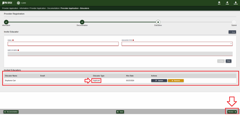 Note: Those who fill out the attestation form and the licensing application should also include themselves on the application with the educator type of Applicant. This will allow the Review button to appear if it is grayed out. Anyone who is supposed to work at the facility but joins after the application is submitted or is mistakenly left off the application can be invited as an educator.