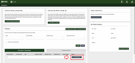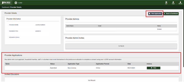 Submission Confirmation: If the application was successfully submitted, the Start Application or Edit Application button will change to a View Application button on the admin page. I-LEAD will also change the status in the Provider Applications section from “Draft” to “Submitted” and show the date your application type was sent. If successful, a new license number will generate immediately in the Provider section of your I-LEAD dashboard. Click Home and check the Provider section of the I-LEAD dashboard. If it's the same license number as before, please click View Details to go back to the application via Edit Application.