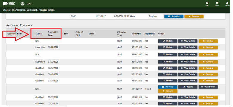 6. Review your associated educator roster: Verify that all provider admins and associated educators are listed on the roster and that staff who no longer work there are removed using the Removed option (Format: MM/DD/YYYY). If anyone is missing, there is an option in the application to add them to the Educators section so long as you have the email address they used to create their own I-LEAD account that belongs solely to them, their date of birth and their legal name. Please see managing educator consent forms for more information.