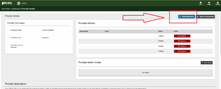4. If you’re switching the application to a new provider, make sure to add them as a provider admin so they can submit the application under the current license. The new provider admin must accept the admin invitation before they will appear in this section. If they don’t appear, send a new admin invitation and ask them to accept it before opening the application.