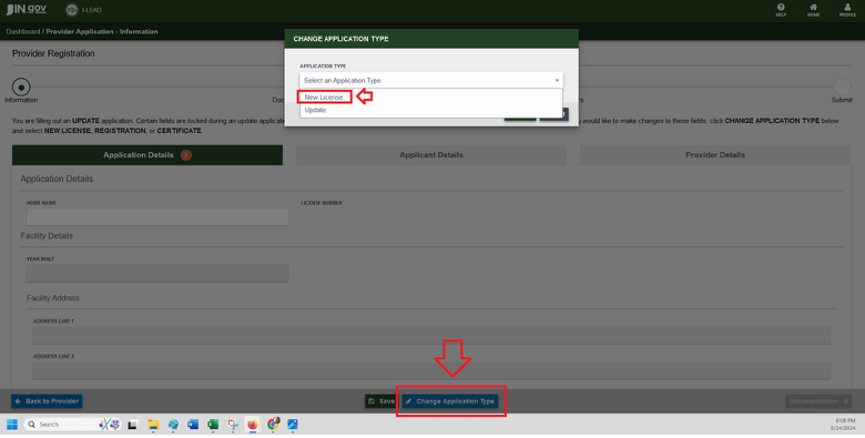 WARNING: Do not select NEW on the Change Application Type button unless you meet the criteria listed above. Selecting NEW issues an entirely new license number for the facility and is irreversible on I-LEAD once signed and submitted.